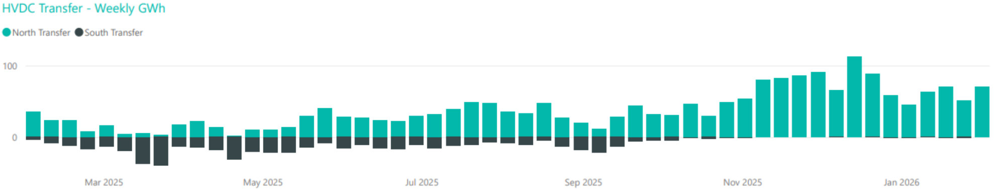 Power transfers on the HVDC link connecting the North and South Islands are important both in showing relative hydro positions and the reliance on thermal power to meet demand. High northward flow tends to indicate a good SI hydro position, whereas the reverse indicates a heavy reliance on thermal power to make up for hydro shortages.