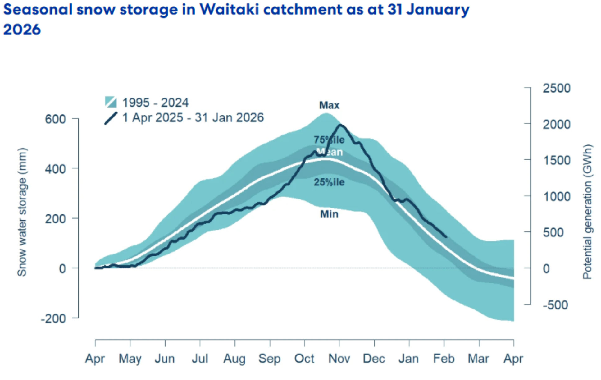 Snowpack is an important way that hydro energy is stored over the winter months and released as hydro inflows in the spring. The following graph shows that the snowpack in the important Waitaki catchment decreased during January but remains close to the 75th percentile level seen in the last 30 years for this time of year.